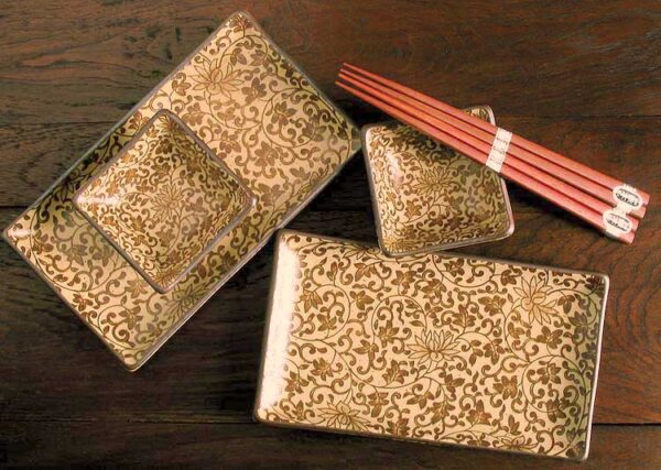 A six piece sushi set for two. A classic design of brown vines on a soft yellow background decorates two 8 1/2″ by 5″ plates and two deep 3 3/8″ square sauce dishes. Two wooden chopsticks complete this natural, earth toned set which is gift boxed.