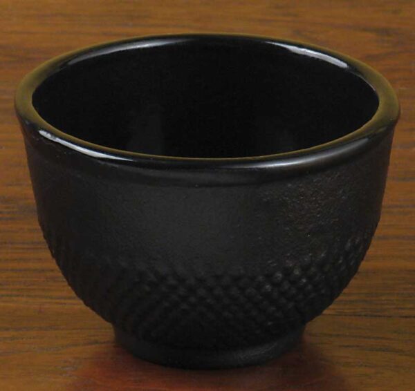 A black cast iron tea cup with the classic Japanese “nail head” pattern. This cup is enameled on the inside to prevent rusting and holds 4 ounces.