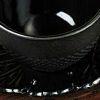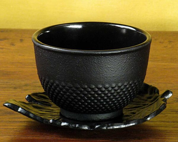 A black cast iron tea cup enameled on the inside and with an “arare” or “nail head” pattern on the exterior.