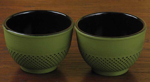 A single green cast iron tea cup with the classic “nail head” pattern. The cup is enameled on the inside to prevent rusting and holds 4 ounces.