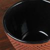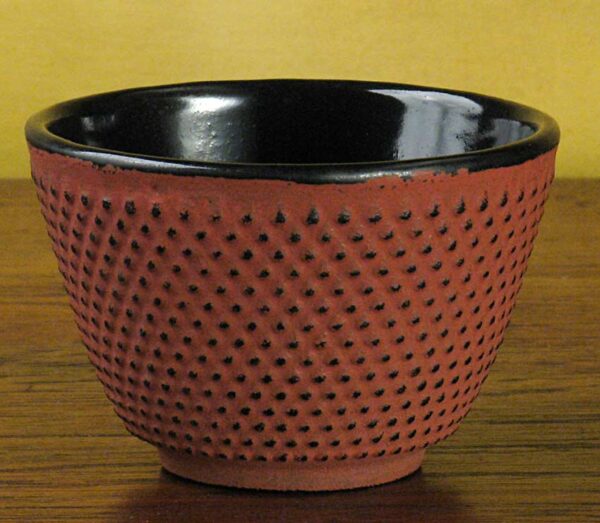 A red cast iron tea cup with a black enameled interior and a pattern of small raised dots know as “arare” or a nail head pattern.