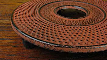Brick red cast iron trivet, 5 3/8″ in diameter, with rubber covered feet for use with our cast iron teapots.