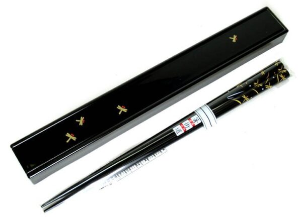 Black chopsticks bearing the symbol for Longevity in a matching black lacquered case with golden cranes (a symbol of long life in Japan) and a Long Life kanji. A wonderful and meaningful gift.