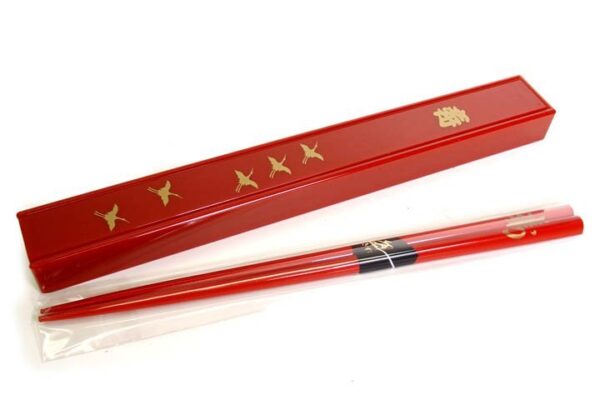 Red chopsticks bearing the symbol for Longevity in a matching red lacquered case with golden cranes (a symbol of long life in Japan) and a Long Life kanji. A wonderful and meaningful gift.