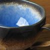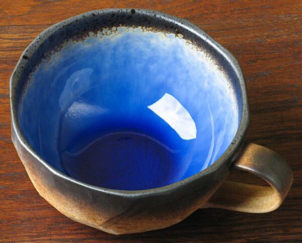 Like a hollowed out stone, this cup has a speckled tan and brown exterior with a metallic silver grey rim and deep inside crackled glass of cobalt blue.