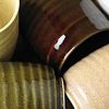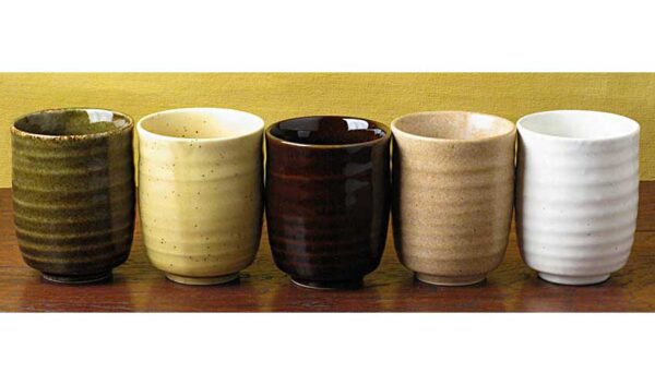 Five tea cups each different. One a glossy deep reddish chocolate, one a satiny wheat yellow, one of speckled sand with a matte surface, one a satiny white and the last a mossy green high gloss cup.