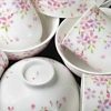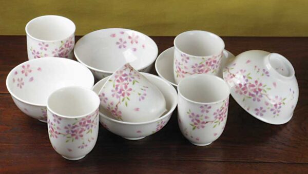 Glossy white bowls and cups with nicely drawn branches of cherry blossoms in pink and purple.