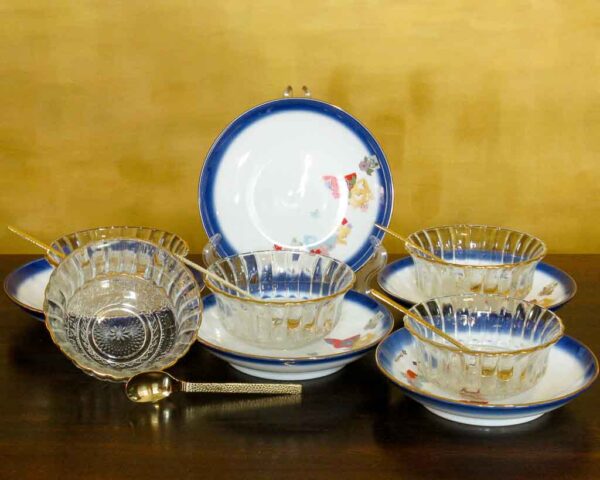 Five scalloped glass bowls, five white porcelain plates with butterfly decorations and five golden spoons make up this Arita dessert set designed by British designer David Hicks.