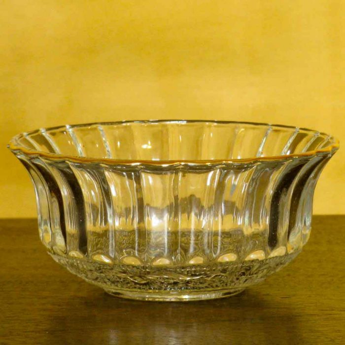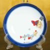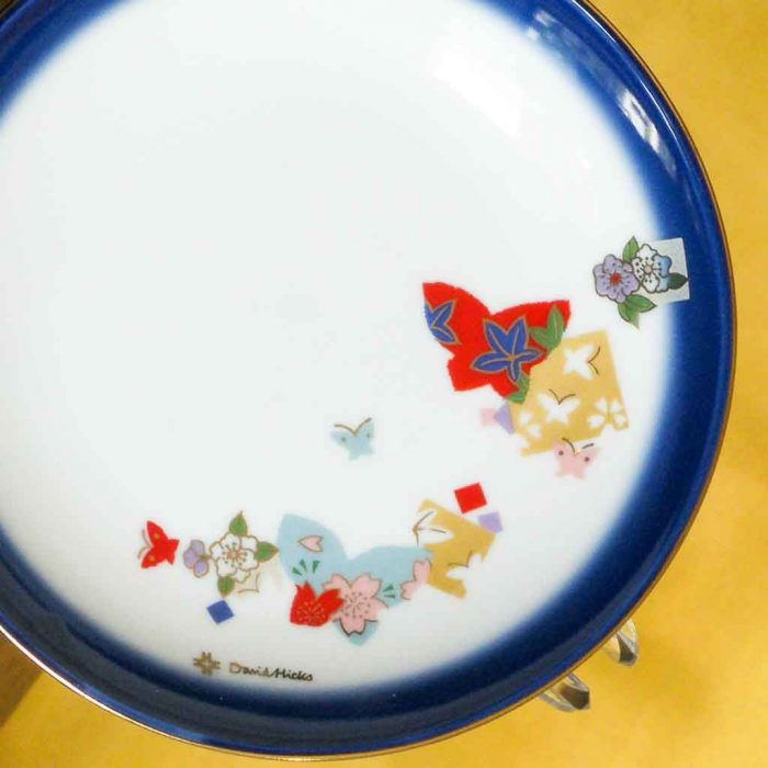 The glass bowls are 4.5″ in diameter and 2″ tall. The metal dessert spoons are 5″ long. The deep, porcelain plates are edged in blue with emaneled butterflies and are 6.25″ in diameter and 1.125″ tall.