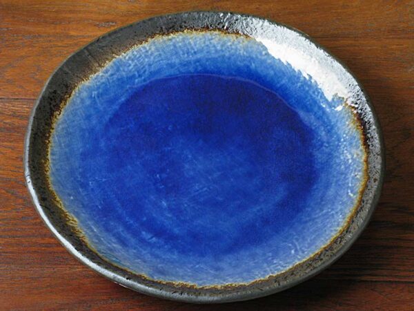 A 9.5″ diameter dinner plate of deep cobalt blue cracked glass sealed under a layer of thick clear glaze. Metallic glaze circles the edges and a rough speckled brown glaze decorates the underside of this dinner plate.