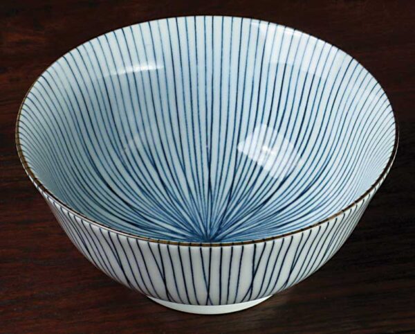 A blue and white arita porcelain bowl, footed, with blue lines representing a bamboo forest. These bowls are sold individually and are 6″ in diameter and 2.75″ high.