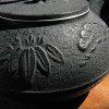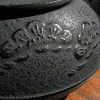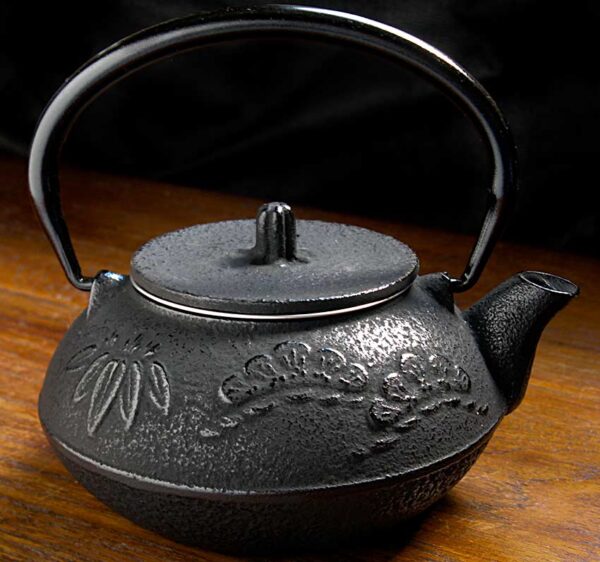 A Japanese made, cast iron, tetsubin. This 9 ounce tetsubin is enamelled on the inside to prevent rusting and has an embossed floral design on the mottled exterior.