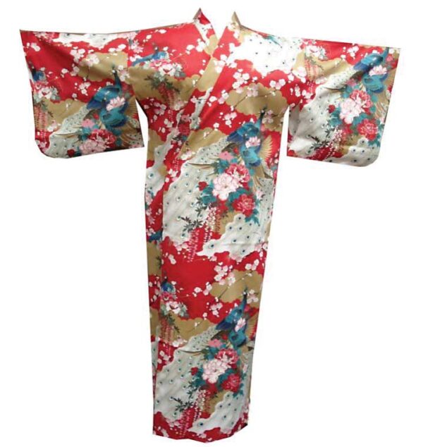 Cherry blossoms and a blue peacock decorate this kimono. Matching belt is included.