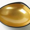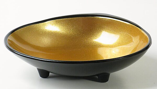 A shell shaped, footed sauce dish with a high gloss, speckled gold lacquered interior and a black exterior.