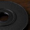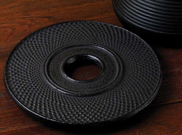 A black cast iron trivet for our larger cast iron tea pots. It is 6.625″ in diameter and the feet are covered in rubber so they won’t scratch your table top.