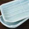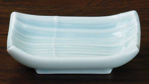 A light blue-green celadon coloured sauce dish. The design is lengths of bamboo bound together. Each sauce dish is 3 5/8″ by 2 3/8″.