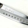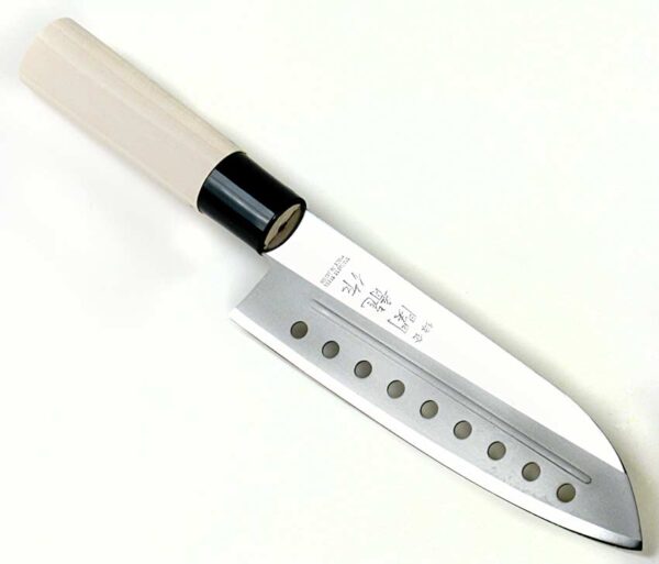 A Japanese Santoku Knife is a western style, all purpose chef’s knife. The shape is similar to a deba knife but would feel more familiar in the hands of a North American chef than that knife. The holes in the blade prevent meat and vegetables from sticking to the blade.