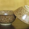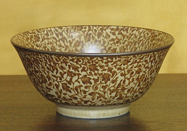 A noodle bowl with the classic Japanese design of brown vines on a soft yellow background. Each footed bowl is 5.875″ in diameter and 2.625″ tall.