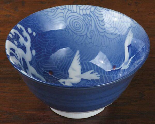 A high gloss blue bowl decorated with 3 cranes and a wave taken from a famous Japanese block print.