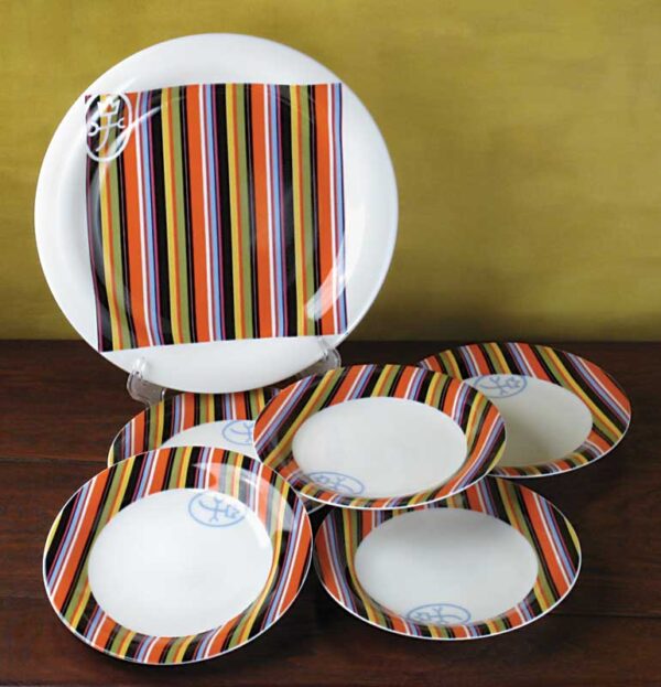 Six brightly stripped, the one large plate is 9.5″ in diameter and the five small plates are 6.5″ in diameter, perfect for a dessert set or a lunch set. This set is gift boxed.