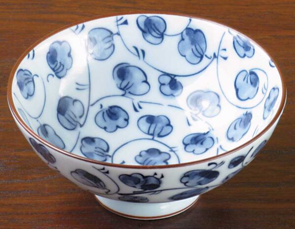 A blue & white rice bowl decorated with scrolling, leafy vines. This footed bowl is 4.5″ in diameter and 2″ high.