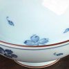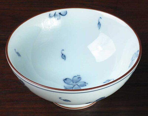 A blue & white rice bowl decorated with “sakura” or cherry blossoms. This footed bowl is 4.5″ in diameter and 2″ high.