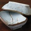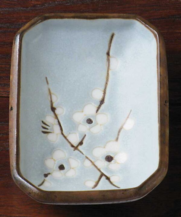 A dappled, pale blue sauce dish with three small branches of cherry blossoms. This sauce dish is 3.5″ by 2.5″.