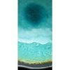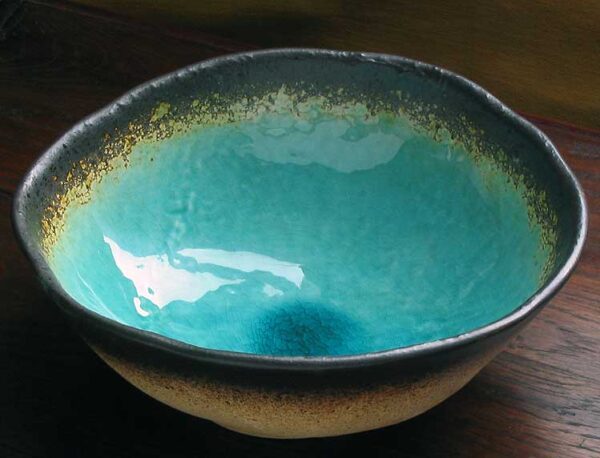A smooth sea blue crackled interior that rises up from a darker blue medallion to a rougher, metallic grey lip which spills over the outside colouring the top half that metallic grey but leaving the bottom half untouched by any colour.