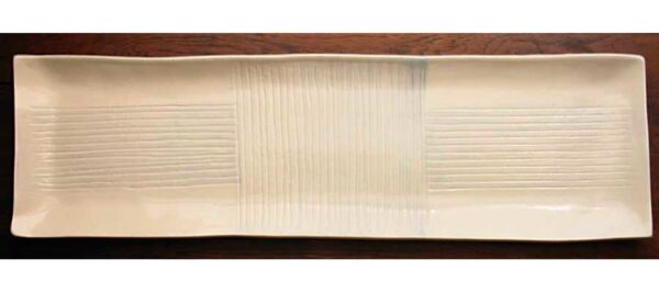 A large serving platter for sushi or other foods. The cream coloured platter has subtle blue areas along with a simple etched design. The platter is 20.75″ long and 6″ wide. the platter is gift boxed.