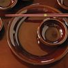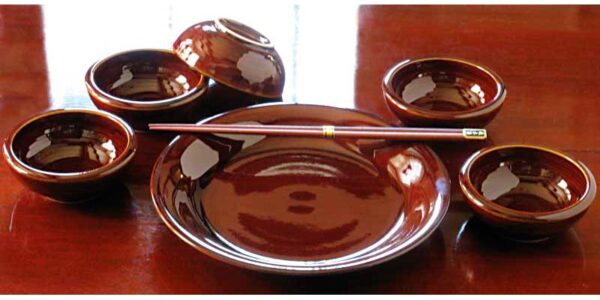 A serving set in a reddish-chocolate coloured glaze. The large central plate is 11″ in diameter. The five bowls are 5″ in diameter. A pair of 13″ long serving chopsticks complete the set.