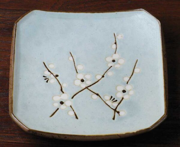 A 5.25″ square plate with cut corners. Ideal as a dessert plate or small sushi plate.