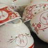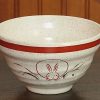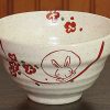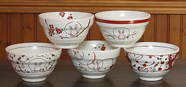 Five cream coloured bowls each with a different hand painted folksy design featuring rabbits!