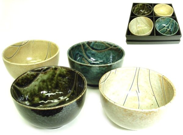 Each of the 5″ diameter bowls has a different look. One is an off-white, one is a stone grey with traces of rusted iron, another is a mossy green and the last is a deep ocean blue.