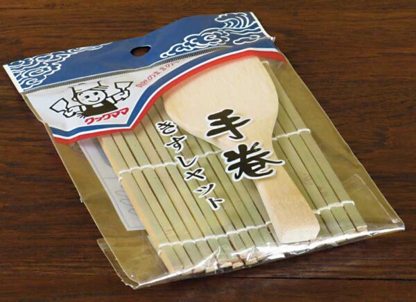 A starter sushi set with a 7″x 5.25″ sushi mat and with a 5.5″ wooden rice paddle or “shamoji”.