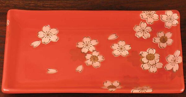 A glossy sushi plate in a slightly muted shade of red and pinkish cherry blossoms done in a contrasting matte glaze. Each plate is 8 5/8″ by 5″.