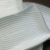 White sushi plates with curving brown lines, sold individually. These sushi plates are ridged and the crest of the ridge forms the brown lines and in the valleys are pools of white glaze. The plates are 8.5″ by 5.5″ and a set of wooden chopsticks are included with each plate.