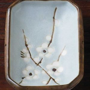 A four piece sushi set in dappled robin’s egg blue with branches of white cherry blossoms.