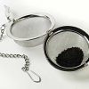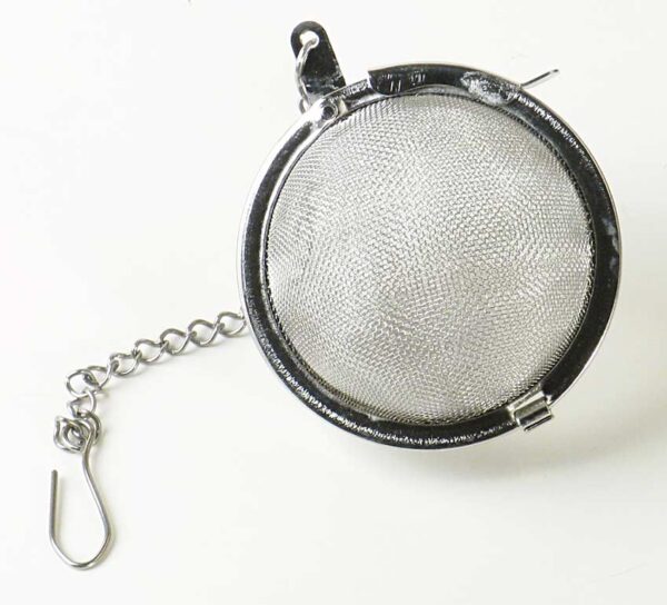 A stainless steel mesh ball with chain and hook for brewing loose tea in a cup or tea pot.