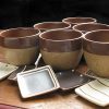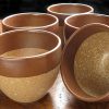 Six small, identical, natural toned four ounce Japanese tea cups each with a different porcelain saucer in browns, tans and ivory.