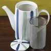 A tall tea pot with indigo blue and sage green stripes on a soft white background. This tea pot holds 16 ounces and includes a stainless steel strainer to hold loose tea.