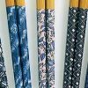 Five pairs of Japanese lacquered wood chopsticks with blue and white print handles.